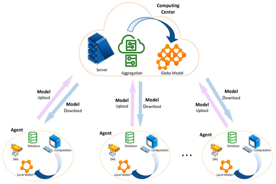 In Section 5.1, we constructed Multilayer Perceptron (MLP) and Convolutional Neural Network (CNN) models based on the federated learning framework. The Federated Averaging (FedAvg) aggregation method was used to aggregate the parameters of each agent at the computing center, and the aggregated model was distributed back to each agent for local model updates. A distributed cost function based on cross-entropy was constructed, and stochastic gradient descent was employed to search for the optimal solution of the model [13].