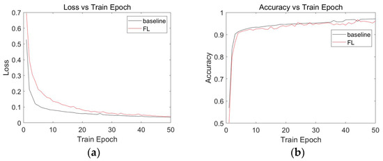 The loss and accuracy profiles of the MLP model for the centralized insulator fault detection algorithm and the federated learning-based insulator fault detection algorithm are presented in Figure 5, where Figure 5a shows the loss profile of the MLP model, with the horizontal coordinate indicating the number of training epochs, and the vertical coordinate indicating the loss value. Figure 5b shows the accuracy curve for the MLP model, with the number of training epochs in the horizontal coordinate and the accuracy in the vertical coordinate. The black curves in Figure 5 uniformly represent the curves obtained by the model in the centralized insulator fault detection algorithm, and the red curves uniformly represent the curves obtained by the model in the federated learning-based insulator fault detection algorithm. From the experimental results in Figure 5a, it can be observed that the loss curves of the baseline and federated learning experiments in the MLP model showed an overall decreasing trend and gradually approached zero, with an increase in the Train Epoch. This indicates that the MLP model exhibited convergence in both the baseline and federated learning modes. As shown in Figure 5b, an increase in the Train Epoch led to a gradual improvement in the accuracy of both the baseline and federated learning experiments. When the Train Epoch approached 50 rounds, the model accuracy of the baseline was above 95%, and the model accuracy of federated learning was also over 95%, demonstrating acceptable model performance.