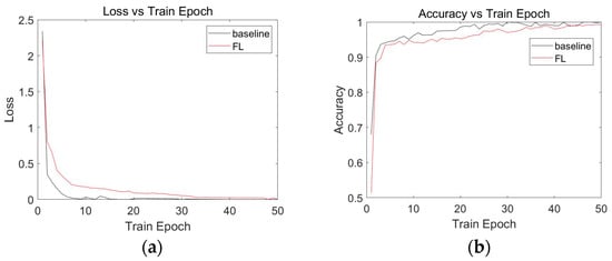 Experimental results of the CNN model. The baseline indicates a centralized detection algorithm and the FL indicates a federated learning-based detection algorithm. (a) CNN model loss. (b) CNN model accuracy.