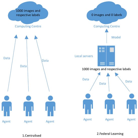 Privacy protection diagram. The left side is the centralized approach the right side is the federated learning approach. The 1000 images and corresponding tags contained in the dataset can be seen. In the centralized approach, this image and tag information is uploaded to the computing center, while in the federated learning approach, this information is only uploaded to the local server and not to the computing center.