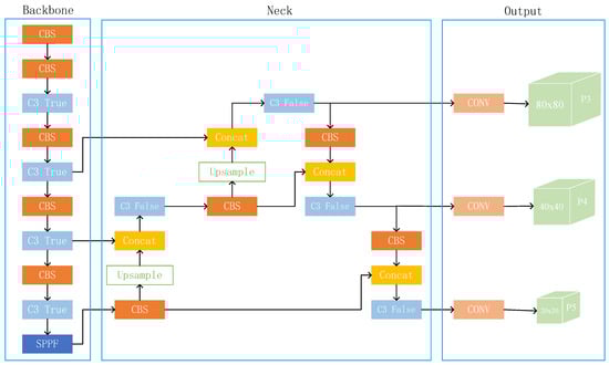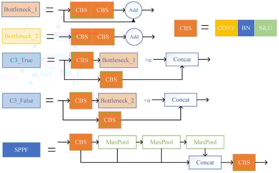 The primary function of the input layer is to unify the size of the input image into a fixed size. The backbone section, which includes the CBS, C3, and SPPF modules, is primarily responsible for extracting essential information from the input picture. The structure of each module is shown in Figure 2. The Neck portion of YOLOv5 employs a mixed structure of FPN [39] and PAN [40]. FPN transfers semantic information from deep to shallow feature maps, while PAN conveys localization information from shallow to deep feature layers. The combination of the two may aggregate characteristics from multiple backbone levels to different detection layers, enhancing the feature fusion capacity of the network.