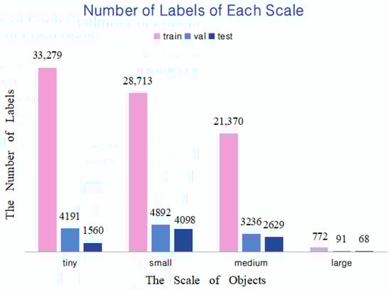 The maximum downsampling step of the YOLOv5s network is 32. Therefore, a resolution less than 32 × 32 pixels is regarded as a small target [41], greater than 96 × 96 pixels is defined as a large target, and in between is classified as a medium target. Since there are a large number of targets with tiny scales in the pictures taken by UAVs, we further subdivide the targets with a resolution less than 32 × 32 pixels into two cases of tiny (resolution < 16 × l6 pixels) and small (16 × 16 pixels < resolution < 32 × 32 pixels). The obtained target scale distribution is shown in Figure 3. It can be found that the number of tiny objects in train, val, and test are all significant. Therefore, it is essential to customize a detection layer more suitable for detecting tiny targets.