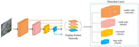 The YOLOv5s network has three detection layers, P3, P4, and P5, with feature map sizes of 80 × 80, 40 × 40, and 20 × 20, respectively. The larger size of the feature map is responsible for detecting smaller objects. The largest 80 × 80 feature map corresponds to an input size of 640 × 640, and the receptive field size of a grid in the feature map is 8 × 8. If the height or width of a tiny vehicle in the original image is less than 8 pixels, it is difficult for the network to learn the features of the object. The new P2 detection branch can detect targets at the 4 × 4 pixel level while configuring anchor boxes of smaller size, thus effectively reducing the missed detection of tiny vehicles.