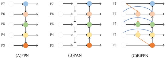 Nevertheless, there is a problem in that input to the PAN structure is largely feature information processed by FPN, with no original feature information taken from the backbone network. This issue may cause the optimization direction of the model to be biased, affecting the detection impact. The BiFPN first simplifies the PAN structure by removing the nodes with only one input and output edge. Then, an extra edge is added between two nodes at the same level to fuse more differentiated features, and the structure is shown in Figure 5C. The original BiFPN would assign various weights to different input features according to their importance, and this structure is utilized frequently to encourage feature fusion. The introduction of BiFPN with weights, however, increases the number of parameters and calculations for the dataset in this research, and the detection effect is not satisfactory.