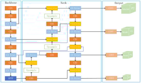 From Figure 4, we can see that the first C3 module in the Backbone outputs a feature map of 160 × 160 after two downsamplings, while the second C3 module produces a size of 80 × 80. We fuse the feature map of 160 × 160 with the output of the second C3 module after upsampling to obtain the detection branch P2. In this way, the input of P2 derives mainly from the shallow convolutional layer and contains more information related to shape, position, and size. This information facilitates the model to discriminate fine-grained features more accurately, thus improving the capability to detect small targets.
