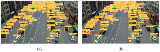 Figure 7a compares the detection performance of YOLOv5 using NMS and Soft-NMS as prediction frame screening algorithms. By focusing on the red dashed box in Figure 7b, it can be found that the application of the Soft-NMS algorithm successfully decreases the number of missed vehicles in the densely arranged region and enhances the detection performance of the model in the high-overlap scenario.