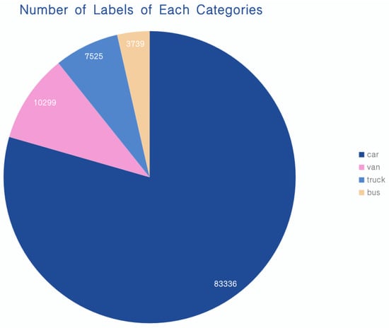 Vehicles of four categories—car, van, truck, and bus—were selected for training, validation, and testing by collating the open-source dataset VisDrone2019-DET [42]. The number of labels for each category is shown in Figure 8.
