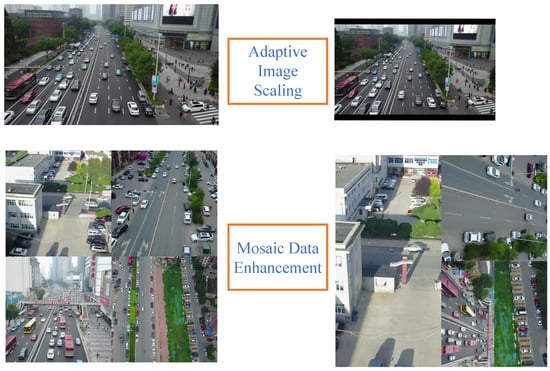 We applied adaptive image scaling and mosaic data enhancement to pre-process the dataset. Because many original images have different aspect ratios, they need to be scaled and padded before feeding them into the model. If the sides are filled with more black borders, it will lead to redundant information and affect the training speed. Therefore, we use adaptive image scaling, which can adaptively add the least amount of black borders to the original images, thus speeding up the learning speed of the model. Mosaic data enhancement selects four original randomly scaled images that are cropped and arranged, and then it stitches them into a new image. This data enhancement method can effectively boost the ability to detect small targets. Figure 10 shows the two data preprocessing types.