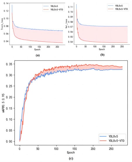 Throughout the training procedure, the YOLOv5 and the YOLOv5-VTO models in this article use the same dataset and parameter settings. The mAP and loss comparison graphs of the two models are plotted according to the log files saved during the training process, as shown in Figure 11.