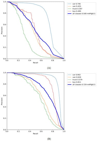The terms TP, FP, and FN indicate the number of objects that were correctly detected, wrongly detected, and undiscovered, respectively. P is the precision, indicating how many vehicles predicted to be in a certain category actually belong to that category in our manuscript. R is the recall, which shows the proportion of vehicles in a category in the dataset that are correctly predicted. It is easy to see that precision focuses on the accuracy of the detected vehicle category, while recall pursues the detection of more vehicles in a particular type. AP is the area under the P-R curve for a single class. Finally, mAP indicates the average AP of all categories and is a composite measure of detection performance.