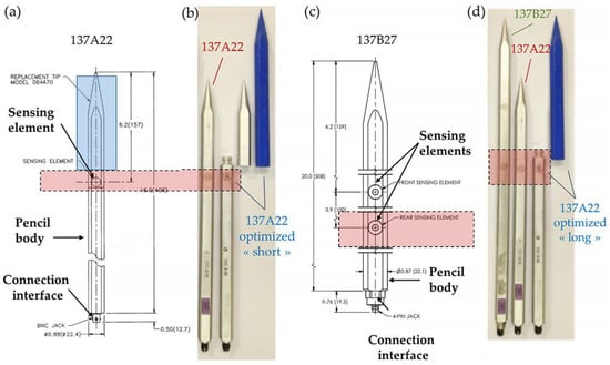 - An experiment has also been conducted in the laboratory using a 137A22 pencil mounted with a “short” tip, as shown in the photograph of Figure 1b, to adjust the length of the 137A22 commercial pencil probe. The aim is to compare the transfer function of both optimized pencil probes with short or long tips.