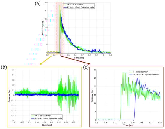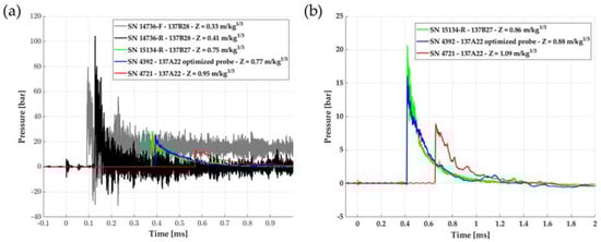 - in Figure 12b, we observe parasites on the green measurement from the commercial probe visible at the step of the signal, before the arrival of the shock wave on the transducer (for times < 0.4 ms). It is not visible on the probe with the optimized plastic tip. The RMS values of the signals were calculated before the arrival of the shock wave and presented in Table 6: the disappearance of those parasites validates the role of the tapered plastic tip in the attenuation of the acoustic wave propagation.