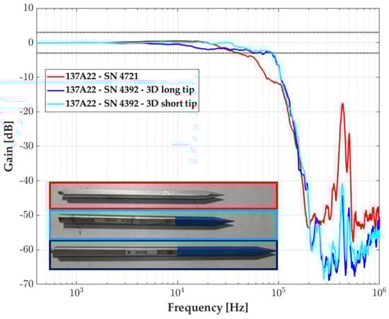 - Free-field experiments were conducted with a 137A22 pencil mounted with a “long” tip to adjust the length to the 137B27 commercial one, as shown in the photograph of Figure 1d. The sensing element is always at the same distance from the rear of the probe since this device part is not modified (in the case of the 137B27, it corresponds to the rear sensor);