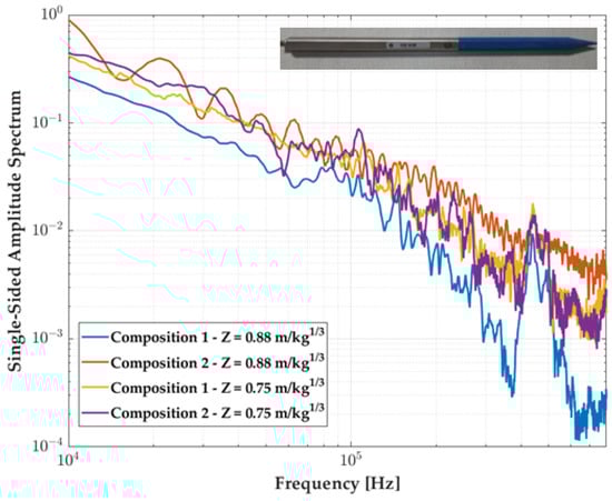 - Figure 12c focuses on the pressure rise region (red dashed zone). A resonant frequency is more present in the pressure measurement of the commercial probe. The improvement of the two-material custom probe here is validated: it reduces the influence of the acoustic waves within the probe and limits the resonant peak of the transducer. In Table 7, we detail the attenuation ratio of the resonant frequency gain (at 440 kHz) for the four combinations of composition and high explosive weights: the resonant frequency reduction average is approximately 66%. Note that the arrival time detection of the shock wave is smaller (0.363 ms) for the commercial probe, than for the optimized one (0.378 ms): this difference of 15 µs is due to the distance from the charge between the two sensors (2 cm, as presented in Table 4), coherent with an estimated velocity of the shock wave of 1300 m/s.