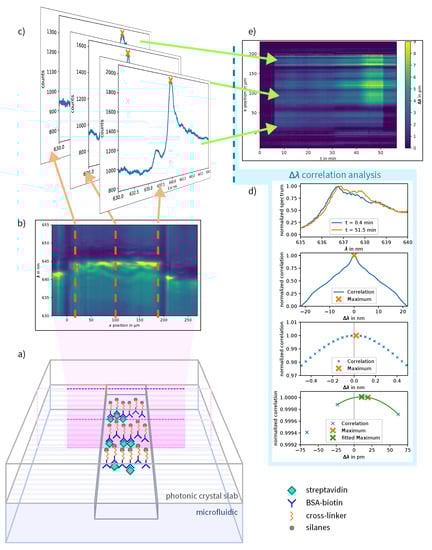 Concept for the measurement and analysis setup. (a) Functionalized photonic crystal slab (PCS) with microfluidic channel. (b) A cross-section of the microfluidic channel is recorded with a spectrometer and a spatial resolution of 1.2 m as kinetic series. (c) Single spectra at different x-positions. (d) The resonance wavelength shift depends on the refractive index change on the PCS’s surface due to protein binding. The shift is calculated for each row by using a cross-correlation based data-analysis procedure. First, the correlation of two spectra recorded at the same position at different times was calculated. The peak of the correlation function is then interpolated with a quadratic function. The position of the peak corresponds to the resonance wavelength shift. (e) Kymograph of the biotin-streptavidin binding experiment.
