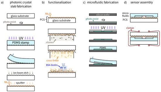 Overview of the fabrication steps for photonic crystal slab (PCS) fabrication, functionalization of the PCS, microfluidic fabrication, and sensor assembly. (a) Fabrication of the PCS by spincoating photo resist onto a glass substrate and imprinting the nanostructure with a polydimethylsiloxane (PDMS) stamp. Afterwards, the structure was etched into the glass substrate while removing the photo resist. Niobium pentoxide was sputtered onto the structured substrate. (b) The PCS from (a) was placed in vacuum, upside down onto a beaker containing (3-Aminopropyl)triethoxysilane (APTES). After subsequent baking, the procedure was repeated with a cross-linking solution. Bovine serum albumin (BSA)-biotin was immobilized onto the surface followed by passivation with BSA in DPBS 1 mg/1 mL. (c) The microfluidic was fabricated by structuring SU-8 photo resist on a silicon wafer to create a negative microfluidic master. Following development, the microfluidic was molded from the master with PDMS. (d) The sensor was assembled by aligning the microfluidic channel with the BSA-biotin functionalization spot. The sensor was fixed with office clamps.