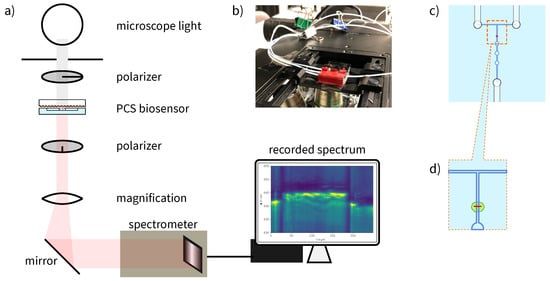 (a) Microscope setup of the measurement. The biosensor was placed between polarization filters and the light was measured in transmission with a spectrometer. (b) The assembled photonic-crystal biosensor with tubing under the microscope. Office clamps were used to open and close the connected reservoirs from the pressure pump. (c) Schema of the microfluidic channel with punching holes for connection of the tubing. (d) Close-up of (c), measurement position (red) and functionalized area (green).