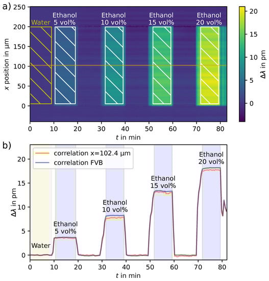 The limit of detection (LOD) is calculated for each single row within the channel and for every refractive index change. Only steady-state values are used for calculation. The median of all row LODs is RIU (refractive index units) with 10 s exposure time per image and RIU with 30 s exposure time. When vertical binning of the spectra within the channel is used, the median LOD is RIU with 10 s exposure time and RIU with 30 s exposure time. The correlation analysis of the measurement of ethanol concentrations in water and the areas used for the vertical binning LOD calculation are marked in Figure 4.