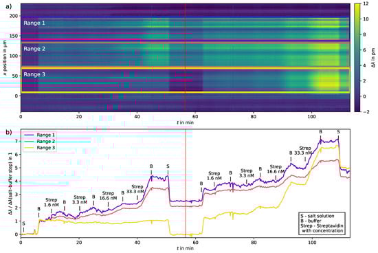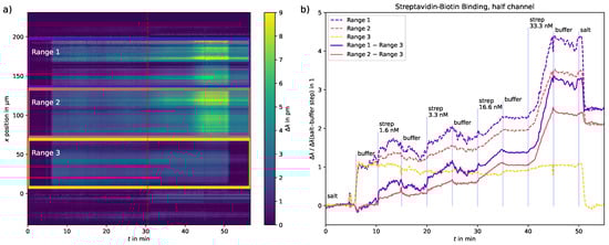 Streptavidin–biotin binding of two consecutive measurements. (a) Image plot of the measurement with channel area markings for vertical binning. (b) Slopes of vertically binned spectra for the channel areas. Buffer and streptavidin in buffer with increasing concentration were injected simultaneously into the sensor until . The upper half of the channel shows streptavidin binding whereas the lower part shows little to no binding. The measurement was repeated from with injecting only one solution at a time to cover the whole channel. The wavelength shift is normalized to the local wavelength shift from NaCl 17 mM in water to buffer for each range.