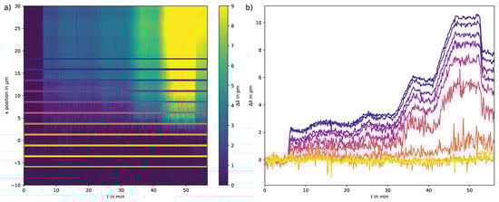 The spectra were analyzed in consecutive order with a cross-correlation algorithm []. Better results were obtained using the correlation approach than a maximum estimation of the resonance wavelength by polygon fitting due to the diversity of the acquired spectra across different channel positions. With correlation, each initial shape of the resonance spectrum can be compared to another recorded spectrum during the series. For this, the correlation was calculated between an initial spectrum of each series and each spectrum within the series, for each position across the channel. The position of the maximum of the calculated correlation served as a measure for the shift of the resonance position. The result was plotted as an image, where the resonance shift is color-coded and the positions across the channel are shown over time.