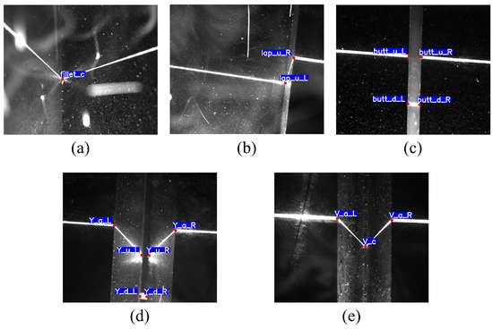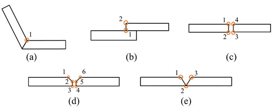 Illustration of the position of the feature points of the different weld types. (a) Fillet joint. (b) Lap joint. (c) Butt joint. (d) Y-shape. (e) V-shape.