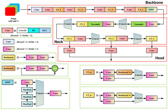 YOLOv5 mainly consists of three parts: backbone, neck, and head. The architecture of the YOLOv5s network is shown in Figure 6. The backbone is responsible for extracting feature information from images. The first layer of the network utilizes a convolution module with a 6 × 6 large convolution kernel to compress the width and height information of the image into channel information, reducing the number of network layers and parameters while expanding the base-level receptive field and maintaining the extraction of feature accuracy as much as possible. The C3 module is the most critical feature extraction module in this network, which essentially serves as a residual module. It divides the input information into two parts; one part passes through the bottleneck module to extract deep features, while the other part passes through only a single convolution module. Finally, the two parts are fused to complete the feature extraction. The SPPF module acquires local features at different scales through multistage max-pooling and concatenates them to increase the receptive field without changing the feature map size. The neck section adopts the PANet structure, which, through top-down and bottom-up pathways, fuses the high-level semantic features and low-level localization features extracted from the backbone network, enhancing the detection effect of different-sized objects and integrating them into different-scale heads. The head is responsible for information output. Different-scale heads have different sizes of feature maps corresponding to different-sized objects. Each grid of the feature map outputs a preselected piece of information, including the predicted category, object confidence, and bounding box center coordinates along with its width and height. Finally, the predicted objects are obtained by filtering these preselected boxes using the nonmaximum suppression (NMS) method based on their confidence and position information.