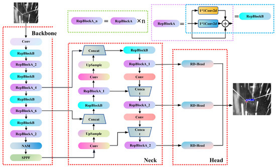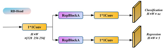 We aimed to strike a balance between the model’s inference speed and accuracy by constructing a novel decoupled head based on RepBlock, referred to as RD-Head, as illustrated in Figure 11. Given the features input from the neck, a 1 × 1 Conv is initially employed to adjust the feature channel count, and is subsequently directed to two parallel RepVGG modules with a stride of one for regression and classification tasks, respectively. Ultimately, a 1 × 1 Conv layer is applied to each branch to acquire the corresponding predictions and concatenate them, yielding an output shape identical to the original detection head. The classification branch produces categorical information, whereas the regression branch provides bounding box dimensions, center point positions, and object confidence. Subsequent experiments demonstrate that the proposed RD-Head significantly enhances network performance.