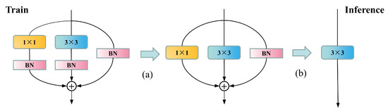 As shown in Figure 8, the reparameterization process consists of two main steps. First, the Conv and BN layers of the same branch are fused. Their equations are expressed separately as