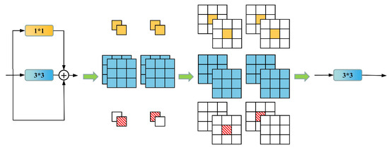 The fusion process of the different tributary Conv layers, from top to bottom, represents the transformation process of 1 × 1 Conv, 3 × 3 Conv, and identity before summation.