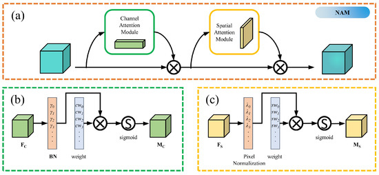 The normalization-based attention module (NAM) used in this study is a lightweight and efficient attention module. It draws on the modular thinking of CBAM [38] and designs separate channel attention and spatial attention modules. As shown in Figure 10, unlike CBAM’s module design, NAM does not introduce additional convolutional layers. Rather, it employs batch normalization (BN) operations directly, adjusts the weights’ standard deviation using scaling factors to emphasize their significance, and uses this as a benchmark to reweight the network. This design allows the NAM module to fine-tune the weights without introducing almost any additional parameters, making it well suited for the network’s lightweight task.