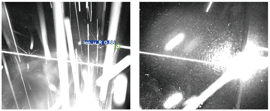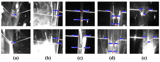 Utilizing these weights to evaluate the test set, the assessment results of the aforementioned metrics are presented in Table 3. The model’s precision and recall achieve 0.990 and 0.983, respectively, signifying the proposed model’s ability to effectively extract image features and accurately detect and classify feature points. With an mAP 0.5:0.95 of 0.751, the model exhibits superior prediction outcomes under various detection standards, further emphasizing the model’s detection performance in highly noisy conditions. The difficulty to further enhance the model’s precision, recall, and mAP during training and testing arises from some images in the actual test set being affected by extreme noise, as illustrated in Figure 14. The figure reveals that intense arc light and spatter noise occupy a significant portion of the image, entirely concealing the feature points and surrounding areas, resulting in a considerably low signal-to-noise ratio (SNR) in the image. Despite the model’s robust local and global perception capabilities, it cannot make confident inferences. This observation underscores the difficulty of improving accuracy and robustness against weld feature points in the inspection process. Nevertheless, such images constitute a minimal fraction of all images; hence, the model can effectively detect weld seam feature points in highly noisy conditions. Moreover, the model’s inference speed is a mere 9.57 ms, with an FPS as high as 104.46 Hz, satisfying the real-time demands of actual industrial production processes.