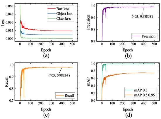In the model training, the input image was resized to 640 × 640 and data enhanced, after which it was used as the network input. We used the stochastic gradient descent (SGD) optimizer in the Pytorch framework, with the initial learning rate set to , and used a weight decay strategy to gradually decay the learning rate during training until it was reduced to times the initial value. The default value of loss gain was chosen, the batch size was set to 8, and the number of training rounds was set to 500.
