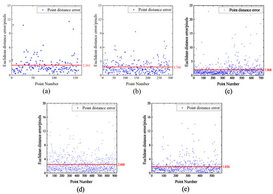 To provide a more intuitive reflection of the model’s accuracy in predicting feature points, we project the output coordinate information onto the original size image and calculate the deviation between the predicted and labeled coordinates on the original size image. For different types of weld seams, the Euclidean distance between the predicted and labeled positions is shown in Figure 15. Our model’s prediction deviation for most images is within 3 pixels, corresponding to an actual deviation of less than 0.15 mm. For a very small number of strong noise images (such as the bottom row in Figure 12), the feature points may be obscured, resulting in a relatively larger inference deviation for the model. Overall, the model achieves excellent performance in detecting feature points for different types of weld seams.
