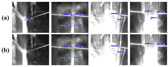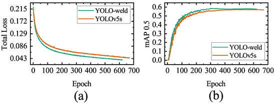 The variation of mAP 0.5 and total loss with the number of training rounds for both models is shown in Figure 17. Notably, YOLO-weld, an improvement over YOLOv5s, exhibits faster convergence, higher optimal accuracy, and superior regression performance. The test results of the model on the test set are shown in Table 8. The YOLO-weld proposed in this study has a slightly lower recall compared to YOLOv5s, but both precision and mAP are significantly improved, and the detection speed is significantly enhanced. Consequently, YOLO-weld also demonstrates enhanced stability and performance in nonwelding target detection tasks, further substantiating its advanced, stable, and scalable characteristics.