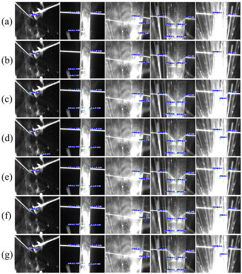 Comparison of YOLO-weld with other neural network models. (a) Faster RCNN. (b) SSD. (c) Center Net. (d) YOLOv4s. (e) YOLOv5s. (f) YOLOv7. (g) YOLO-weld.