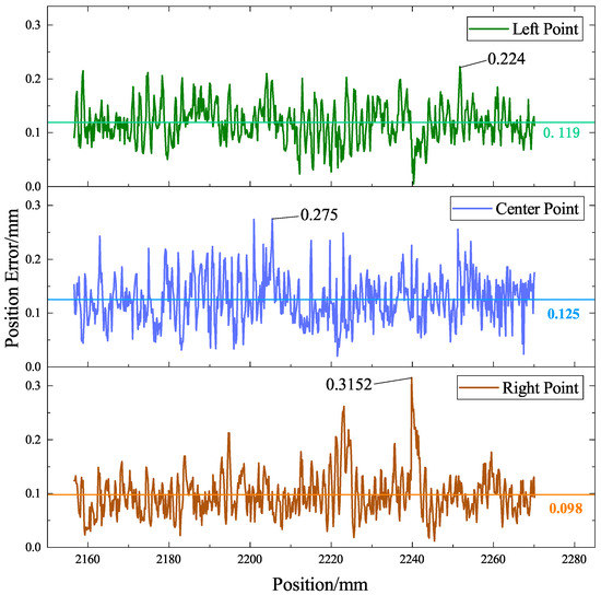 To further quantify the performance of the model, the Euclidean distances between the point cloud of the weld feature points predicted by YOLO-weld and the reference point cloud results were calculated. The comparison results are shown in Figure 20. As can be seen from the figure, the three feature points of the V-shape welds have high accuracy. The average position error of the left feature point is 0.119 mm, with a maximum error of 0.224 mm; the average error of the center feature point is 0.125 mm, with a maximum error of 0.275 mm; and the average error of the right feature point is 0.098 mm, with a maximum error of 0.3152 mm. The average error of all feature points is 0.114 mm, which adequately meets the practical welding requirements and reflects the ability of the proposed model to overcome noise interference and ensure accurate recognition of the weld feature points.