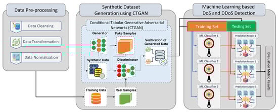 This section describes an approach to detect TCP and UDP DDoS and DoS attacks on IoT networks using CTGAN to produce adversarial samples that are highly representative of actual IoT network traffic. To further improve the accuracy of DDoS and DoS detection in IoT networks, these samples are used to train several shallow ML and DL classifiers. CTGAN can replicate data with near-perfect statistical accuracy since it is trained using real-world samples. Figure 1 depicts the three stages of the proposed approach: (1) data pre-processing, (2) synthetic data creation using CTGAN, and (3) machine learning-based DoS and DDoS detection. These three stages will be discussed in detail below.