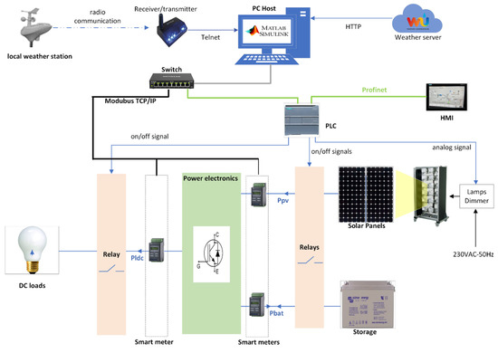 - Physical system: made up of two PV panels, batteries, DC loads, a solar emulator, and a weather station.