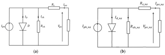 A PV panel is made up of numerous identical PV cells connected in series to provide a higher voltage. A PV module composed of identical cells in series can also be represented by the equivalent circuit shown Figure 4a but the circuit needs to be modified [43] as follows (Figure 5b):