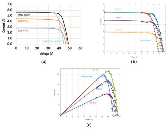 The dotted curves in Figure 5 represent data from the datasheet and the continuous ones come from the mathematical model. These results show a good correlation between the model and the solar panel manufacturer’s data.