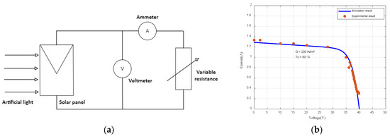 To assess the model’s effectiveness, we conducted indoor tests of the PV panel. The PV panel was illuminated using an artificial light source, while its output was connected to a rheostat. To obtain the I-V curves, measuring instruments were integrated, as depicted in Figure 7a.