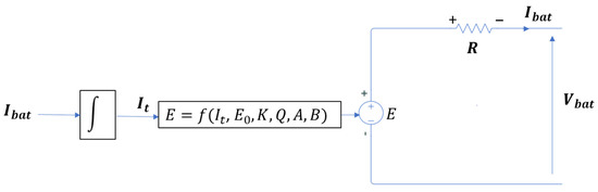 The battery model in Figure 8 considers a constant internal resistance. This resistance is connected in series with the internal voltage source which depends on various parameters [45].