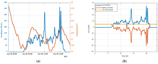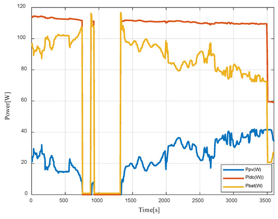 Between 757 s and 876 s, as well as from 932 s to 1317 s, the solar irradiance remains below 50 W/m², leading the system to switch to mode V (system OFF). From 1317 s to 3508 s, the system once again operates in mode II. During the period from 3508 s to 3600 s, the load demand gradually decreases from 111 W to 60 W, causing the battery to generate less power to meet the load requirements.