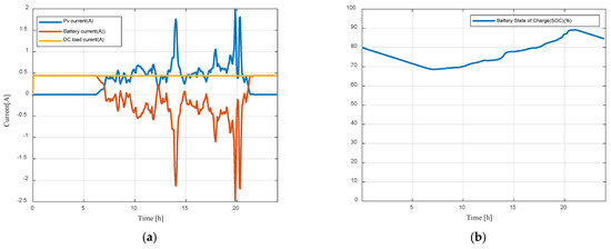 (a) PV, Battery, and DC load currents; (b) Battery state of charge.