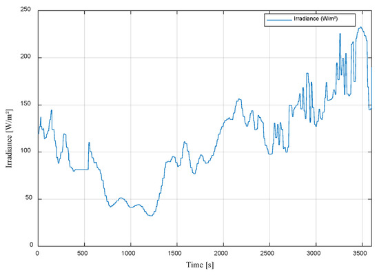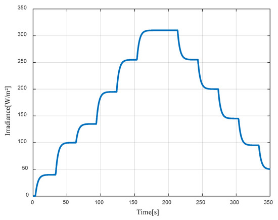 The applied solar irradiance is presented in Figure 19. From the figure, we can see that the artificial source causes a slight delay and behaves like a first-order system with non-linear behavior depending on the increase or decrease in light. This is due to the light dimmer.