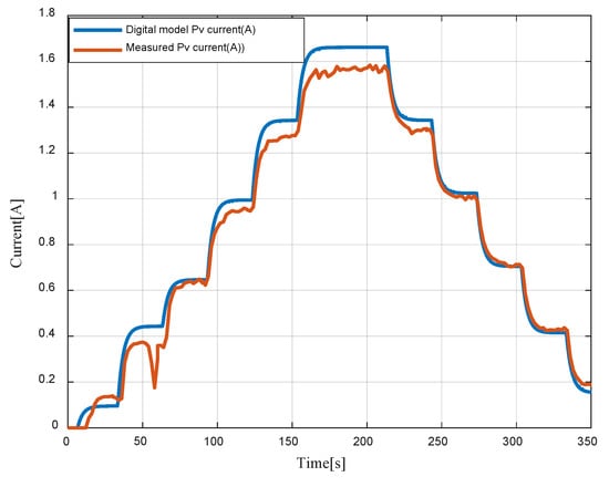 Figure 20 represents the measured PV current and the PV numerical model, highlighting a slight deviation observed in the illumination levels around 300 W/m². This difference is due to both the approximation of the mathematical model and the non-uniform illumination of the PV panels. Furthermore, it should be noted that the maximum relative error is approximately 6%, and the maximum absolute error is around 0.1, which is considered low.