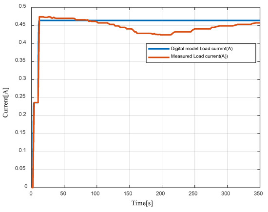 In Figure 21, the measured and digital model load currents are depicted. The tests were initiated by activating a single lamp and subsequently both lamps. This led to an increase in the DC current from 0.23 A to 0.46 A.