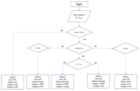To establish a feedback loop between the virtual and real word of the digital twin, we implement an energy management algorithm in MATLAB Simulink. The rule-based energy management algorithm sends control signals to the PLC (s7 1200). The advantage of using a rule-based control approach is its ease of implementation in real-time [52]. The flowchart of the energy management algorithm is illustrated in Figure 24. It receives measurement data as inputs and generates relay control signals as outputs, which are subsequently transmitted to the PLC.