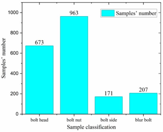 To improve bolt identification accuracy, the bolt’s exposure and the shot’s angle were used to classify the bolt. Four classification labels were defined: “bolt head”, “bolt side”, “bolt nut”, and “blur bolt”. The bolt image was then manually labeled with LabelImg to retrieve the ground truth bounding box. Four categories in bolt target detection and the corresponding labeled images are illustrated in Figure 1, and the statistics for the four categories of classification are presented in Figure 2.