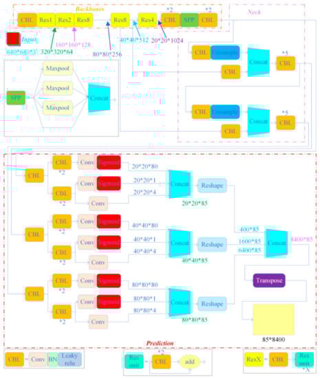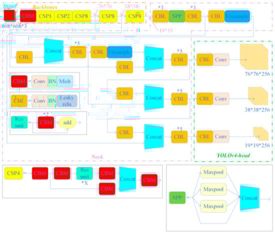 The backbone network of YOLOv4 is based on a modified Darknet-53 model (CSPDarknet53), which is a deep convolutional neural network composed of 53 convolutional layers. The network includes five residual blocks, generating multiple feature maps that enable target detection at various scales. The features obtained from the backbone network are used to construct a feature pyramid with high resolution, which is achieved by leveraging the Spatial Pyramid Pooling (SPP) [,] structure and Path Aggregation Network (PANet) []. The SPP structure applies maximum pooling layers of different sizes to extract contextual information at different scales, while the PANet fuses features at different levels through lateral connections. YOLOv4 introduces three YOLO heads for classification and regression, which use anchor points of various sizes to accommodate target regions of different scales. The YOLO head takes the feature map as input, utilizing a 1 × 1 convolutional layer and a 3 × 3 convolutional layer to predict the class and bounding box of each anchor point. Finally, YOLOv4 employs several optimization techniques, such as batch normalization (BN), a Mish activation layer [], and cross-stage section (CSP), to enhance its performance.